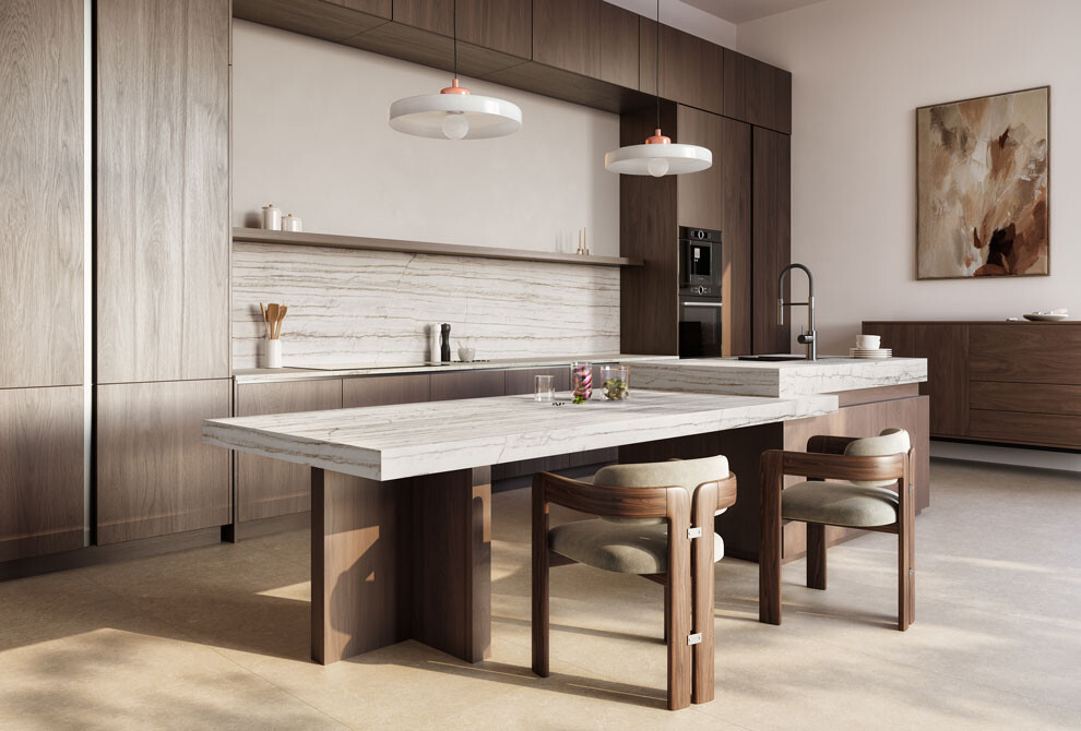 時間沉積的層層岩縫,溫潤且富有節奏感,在微灰與米白層次間,呈現日系侘寂的優雅、純淨、寧靜,如同山脈地層的痕跡,也恰似晨霧中輕柔拉開的光影,讓空間多一份自然與精緻的深沉感受。